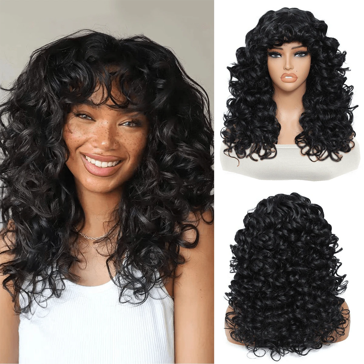 合成耐熱假髮,彈性捲度帶劈頭短髮黑色18英寸化學纖維短髮日常佩戴易於初學者操作的大彈性捲曲短髮