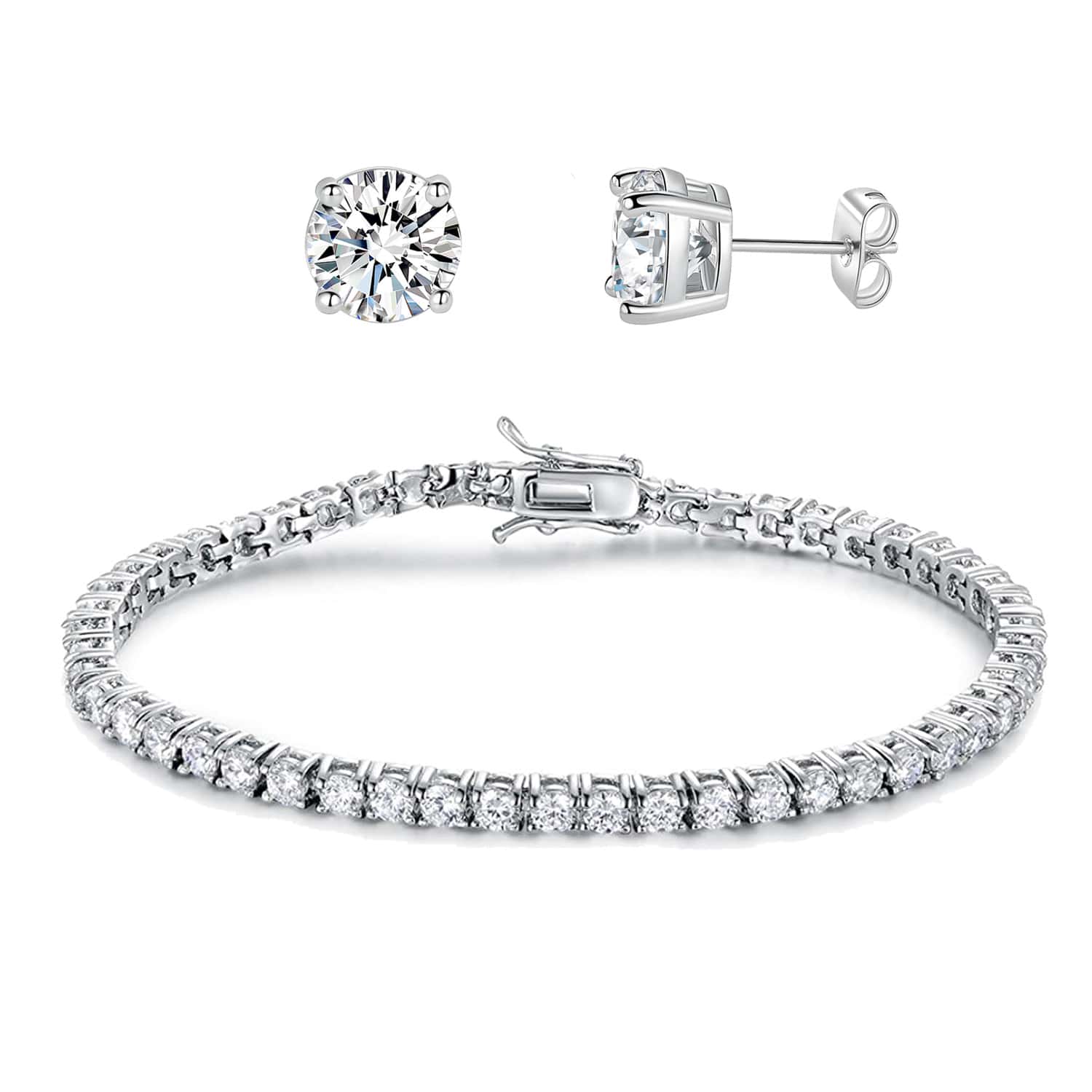 MDFUN 18K白金镀层网球手链耳环套装,3毫米圆形立方氧化锆网球手链和6毫米立方氧化锆耳环套装,男女皆宜