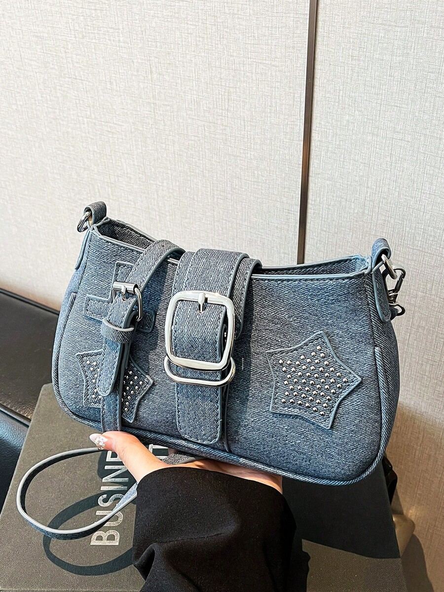 1 件深蓝色仿牛仔斜挎包,饰有铆钉星星贴片和可调节斜挎带。复古西式波西米亚风女士钱包,日常使用完美之选。形而上学美学配饰,别致铆钉手提包,配方形扣腰带