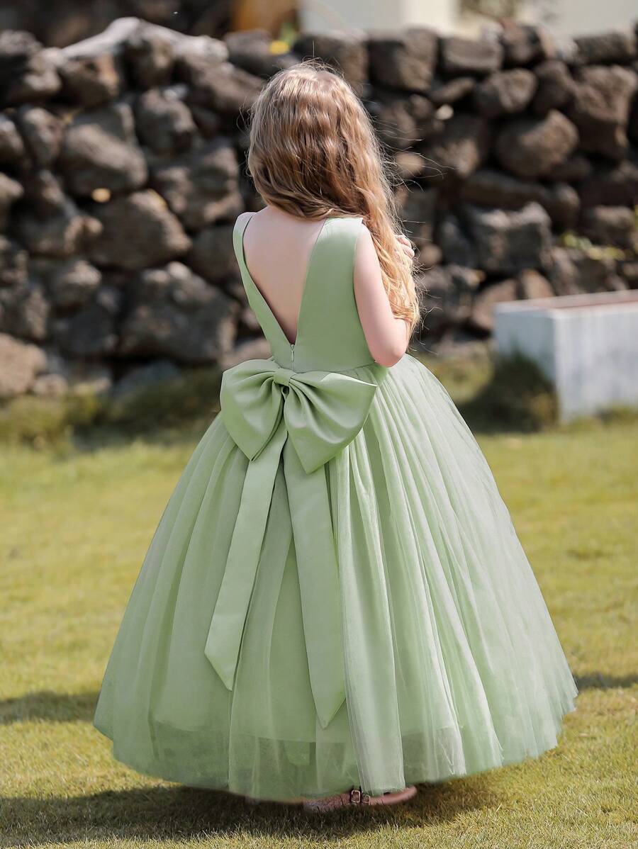 少女浅绿色花童礼服,大蝴蝶结,长款正式伴娘礼服