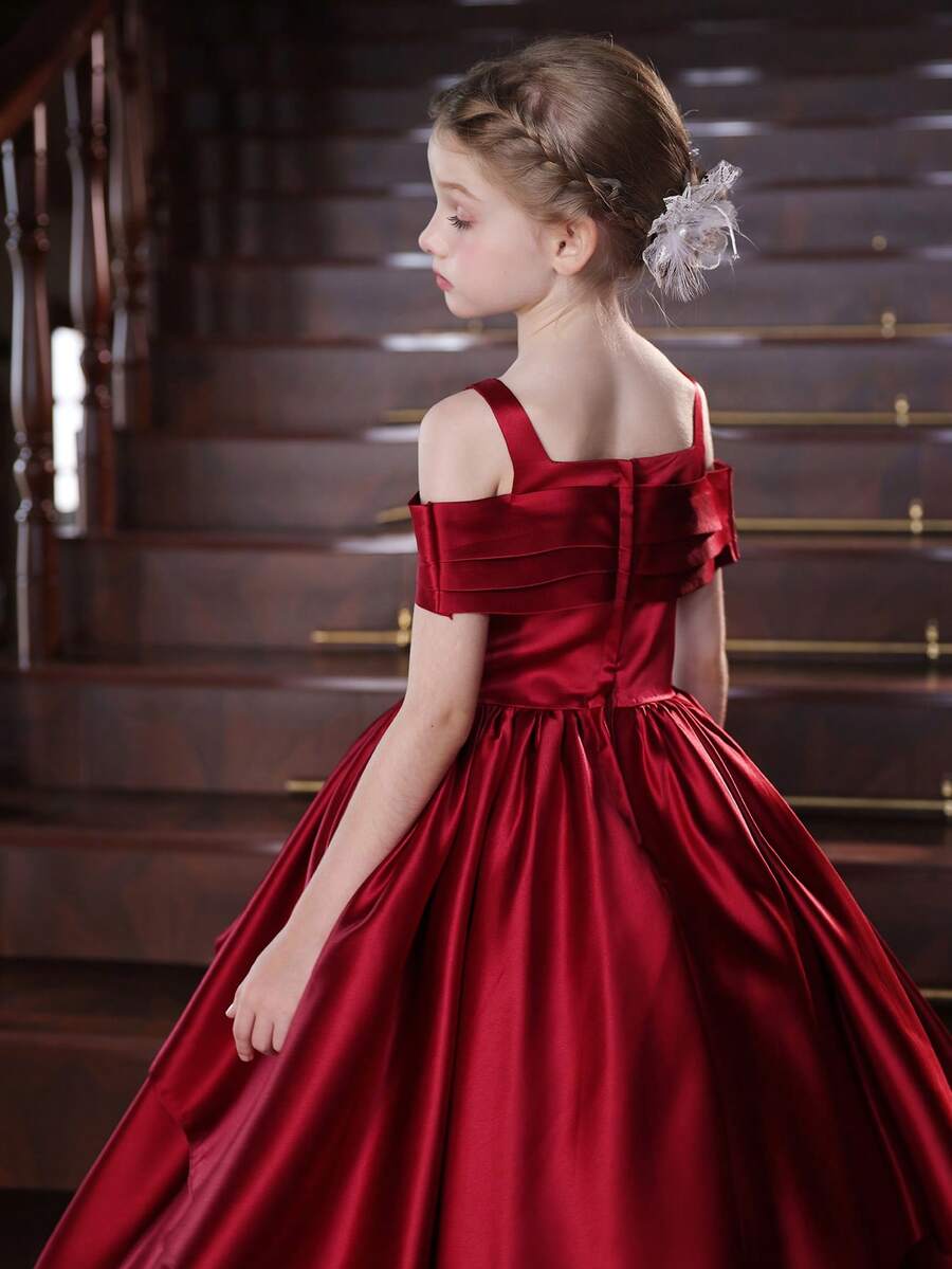 青少年女孩长款露肩酒红色连衣裙,适合儿童生日派对、婚礼、新年、圣诞节、节日场合、花童礼服、舞会、派对