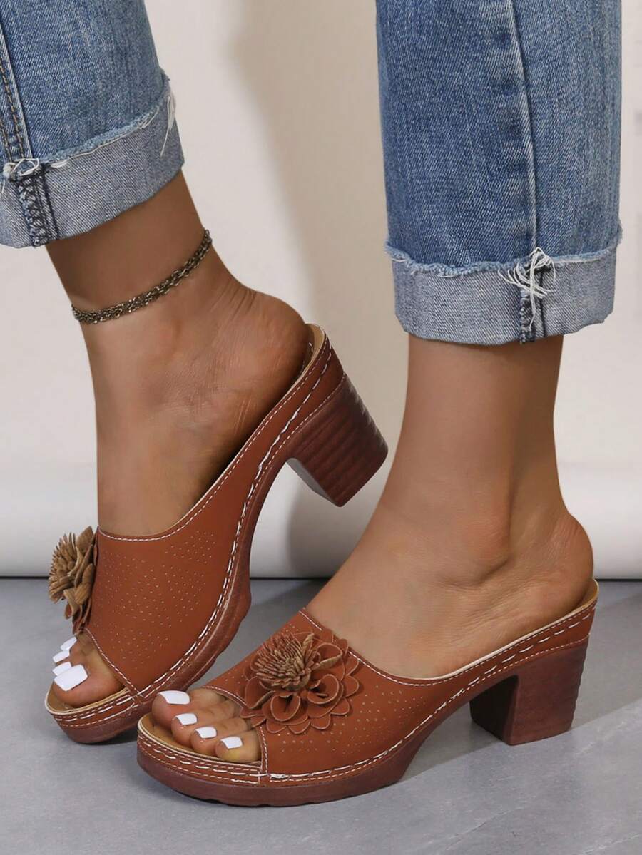 欧美风格粗跟花朵装饰女士一脚蹬凉鞋,厚底粗跟正装鞋