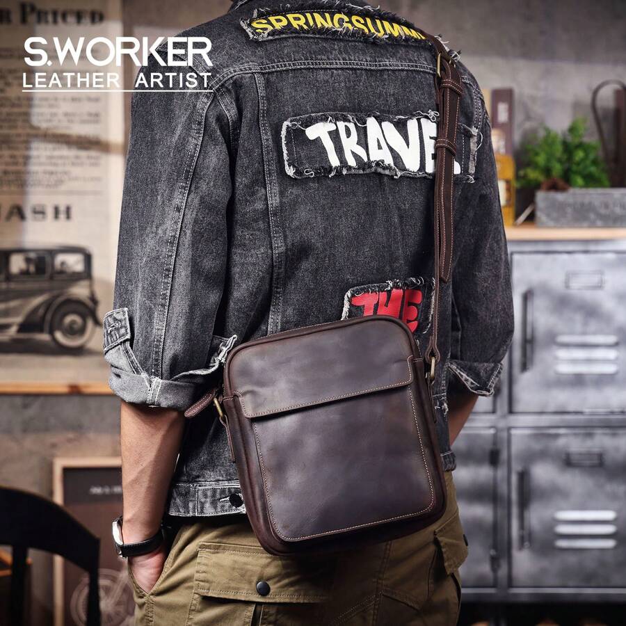 男士复古皮革邮差包 - 适合工作和旅行的休闲斜挎包 - 疯马皮革单肩包,采用真皮材质