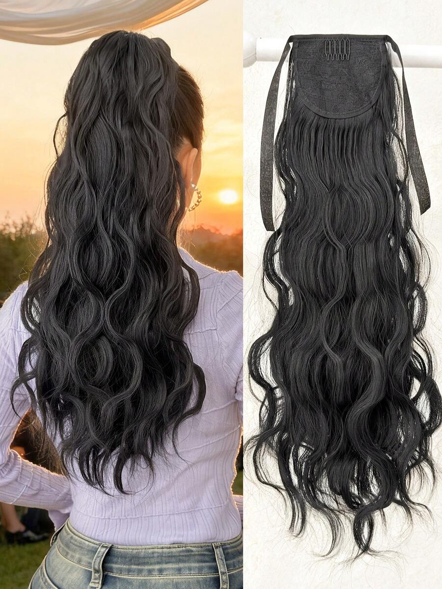 22英寸黑色波浪卷曲合成纤维夹式接发,可打造长马尾辫造型
