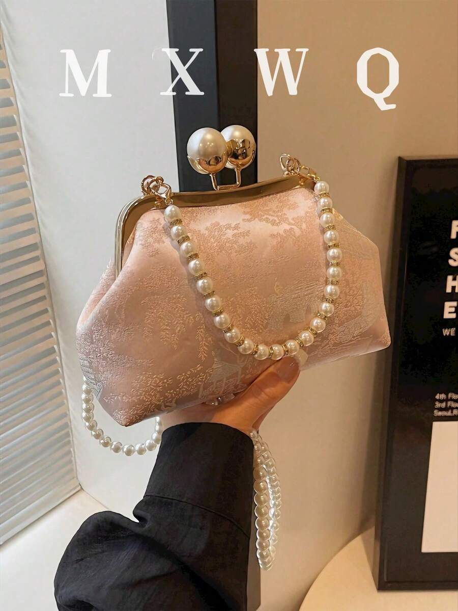 全新复古绿色面料珍珠链手提包,优雅斜挎单肩包,适合派对和聚会