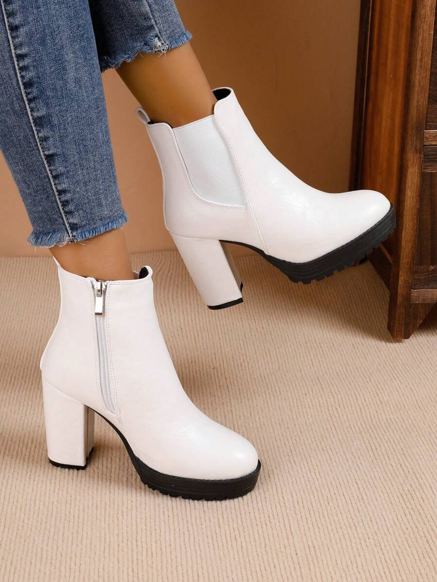 女性厚底高跟防水平臺圓頭彈力側拉鍊時尚白色靴子,適用於春季、秋季、冬季