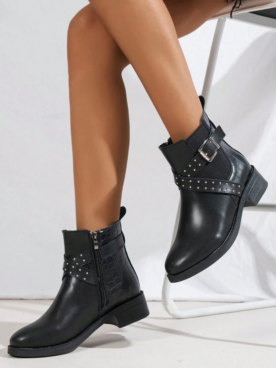 女士搭扣铆钉粗跟踝靴,圆头侧拉链新款秋冬靴,舒适黑色休闲时尚靴