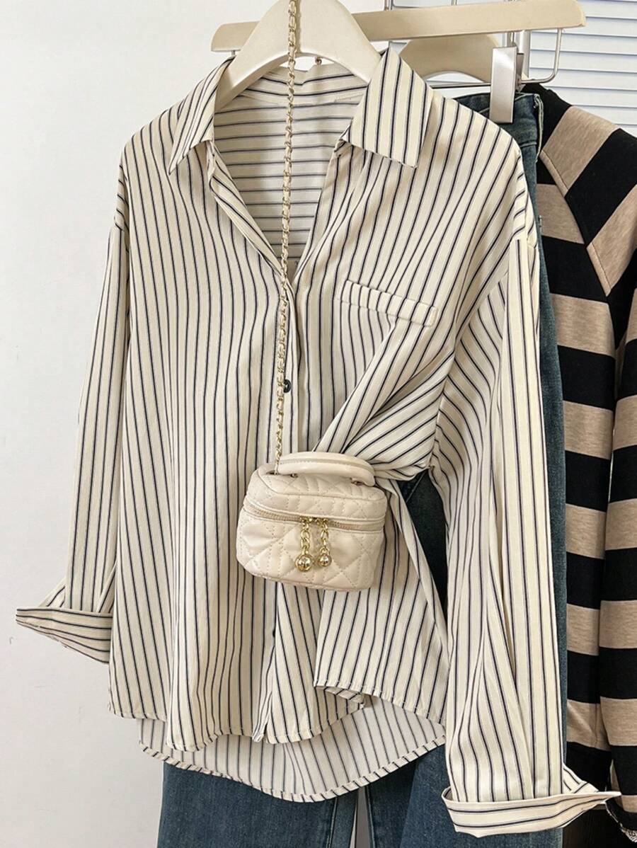 女士休闲日常纽扣长袖条纹衬衫