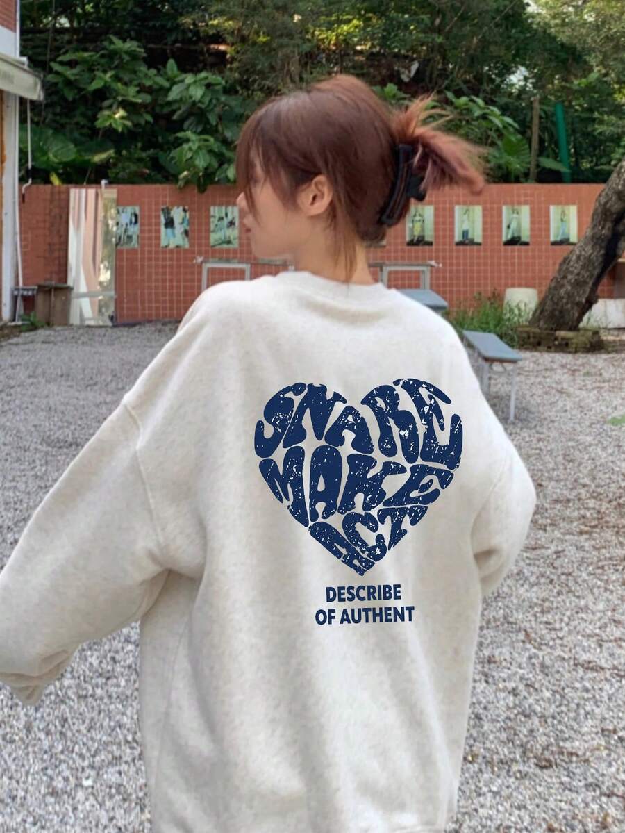 女式休闲宽松图案印花灰色圆领运动衫,秋季