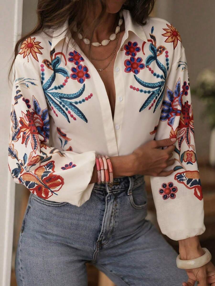 女士休闲度假优雅浪漫经典花卉叶图案印花衬衫