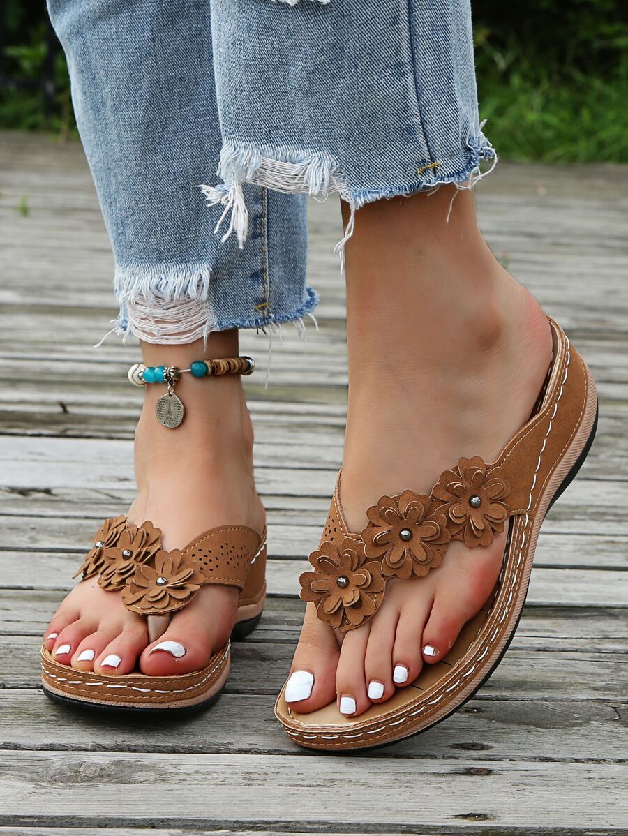 女士花卉缝线尖头坡跟厚底人字拖