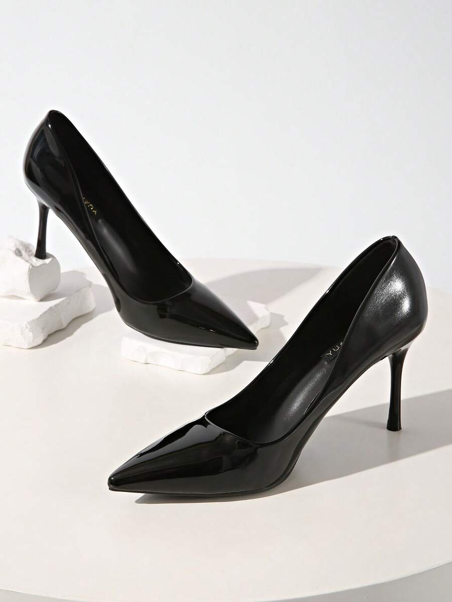 女士高端黑色亮面皮革8.5厘米细跟尖头浅口性感夜店时尚婚礼通勤日常高跟鞋,优雅