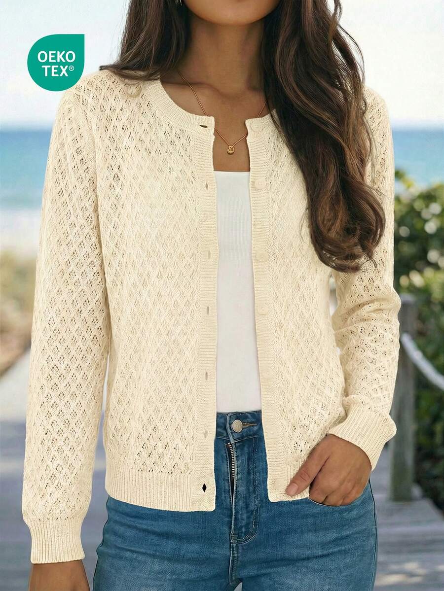 女士柔软圆领单排扣宽松针织开衫