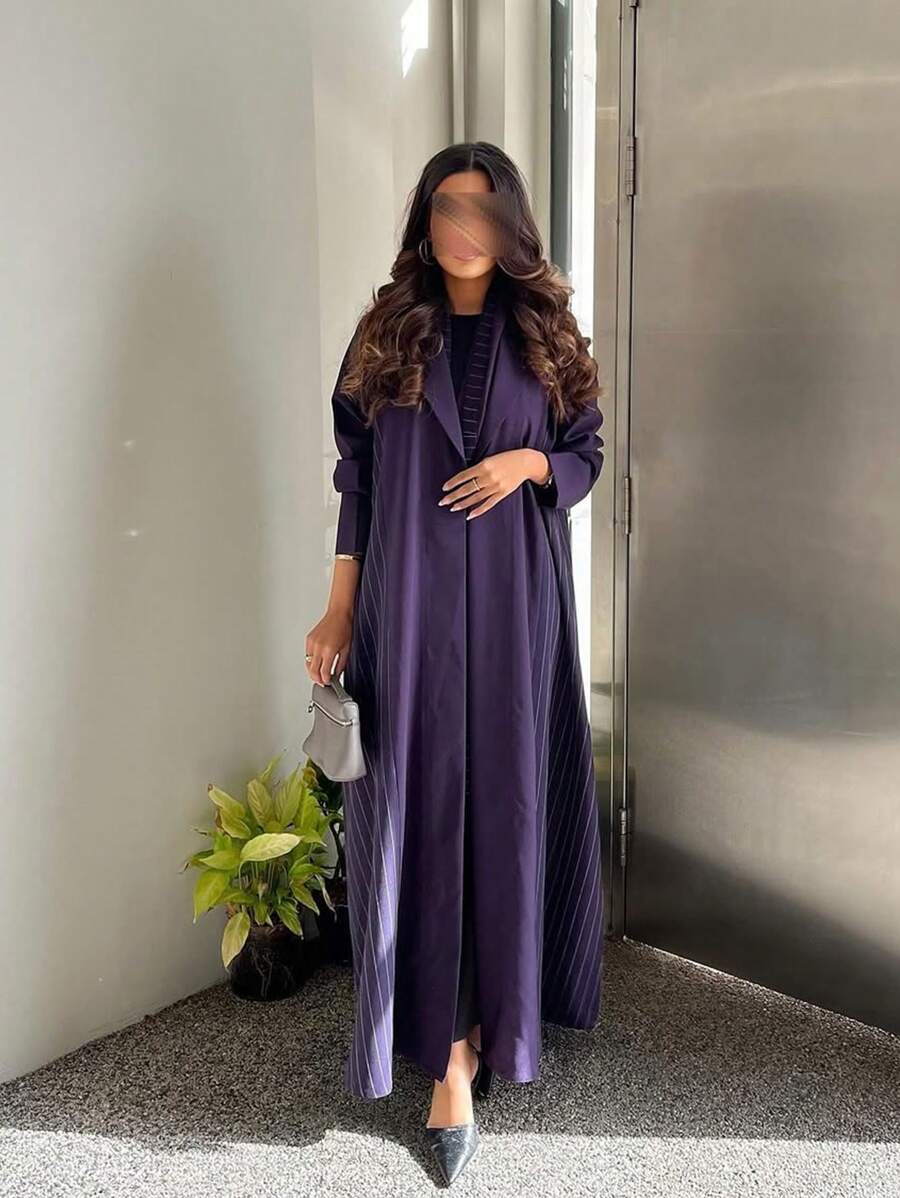 女士条纹紫色长袍外套,优雅前开式长袍,翻领,适合日常通勤,端庄,长袍