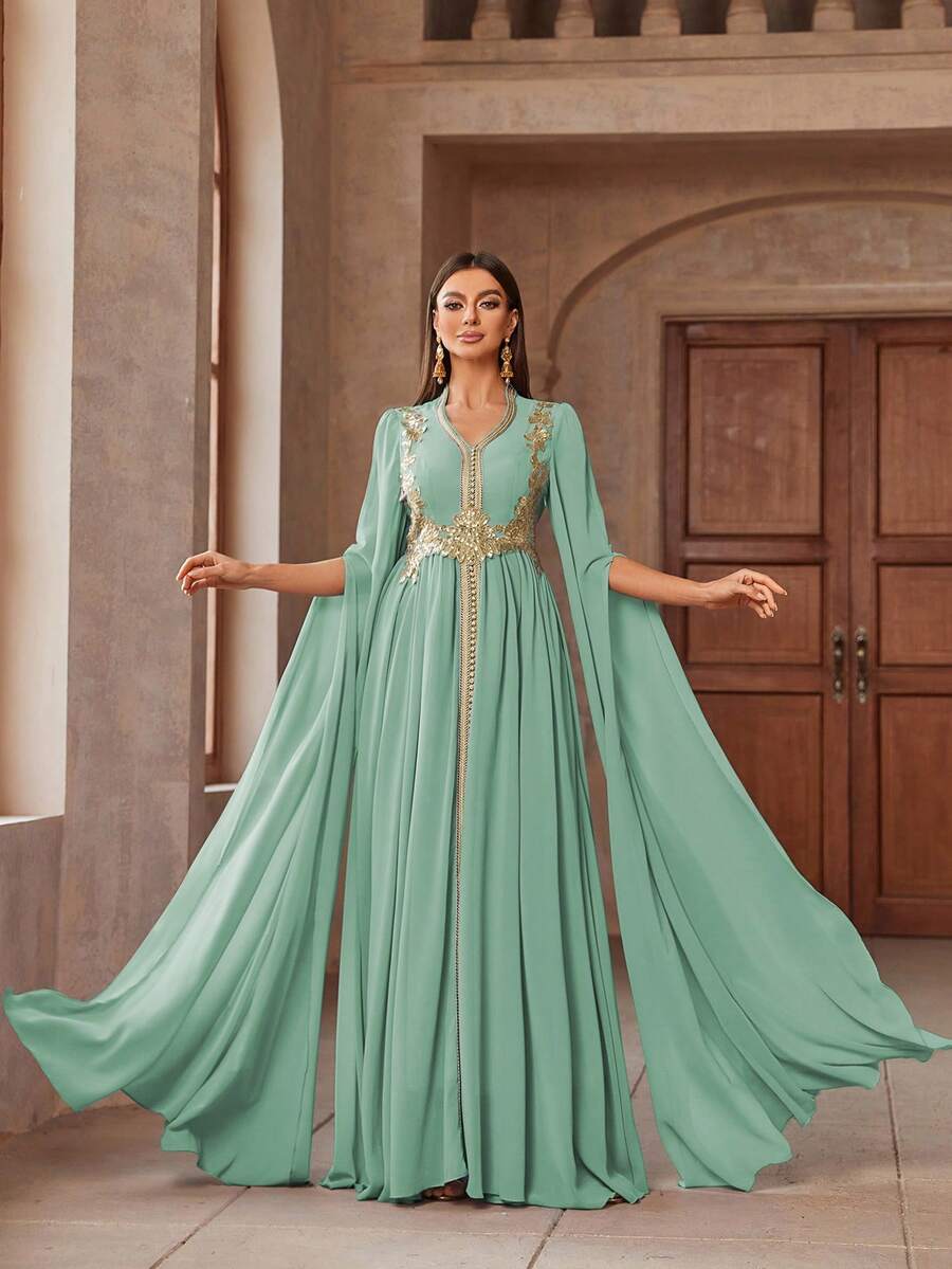 女士 V 领贴花披肩优雅阿拉伯长裙,端庄的卡夫坦