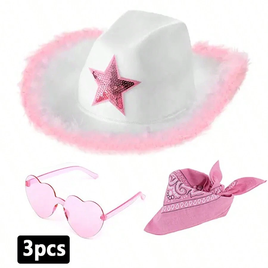 3 件套女式白色五角星粉色羽毛西部牛仔帽 + 粉色心形太阳镜 + 粉色围巾,适合圣诞节、音乐节、舞会使用。牛仔帽女牛仔帽万圣节