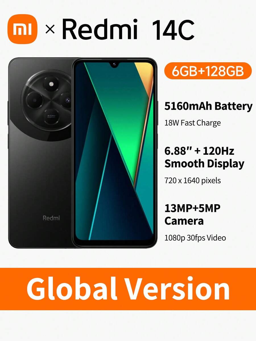 Xiaomi Redmi 14C 智能手机 | 6GB RAM + 128GB ROM | 6.88 英寸 HD+ 90Hz 显示屏 | 13MP AI 双摄像头 | 5160mAh 电池 | 18W 快速充电 | 4G LTE 双卡 | 侧面指纹 | HyperOS | 全球版本