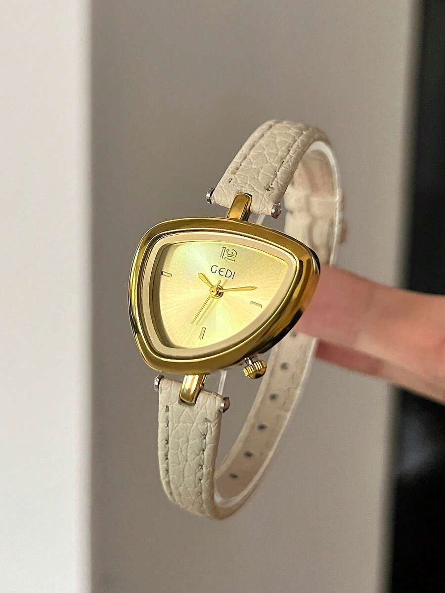 gedi 1件女士新款金色皮表带腕表,精致多边形表盘,时尚金色指针,休闲优雅,魅力十足的女士腕表,30米防水奢华石英表,适合派对、通勤、旅行和日常佩戴。